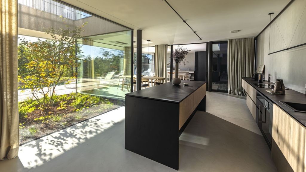 The interiors are carefully arranged to ensure both functionality and comfort. Spacious bedrooms with modern en-suite bathrooms create a calm and intimate atmosphere, while open-plan living areas with fully equipped kitchens and dining spaces form the heart of each villa. Large glass walls seamlessly connect indoor and outdoor living, filling the space with light and offering beautiful views of the gardens and pools.