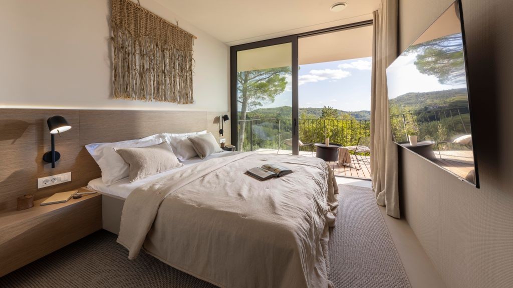 King size bed, En-suite bathroom with stand-alone shower and a rain shower, Television, Air-conditioning, Heating, Soundproof, Black out curtains, Balcony, Forest view