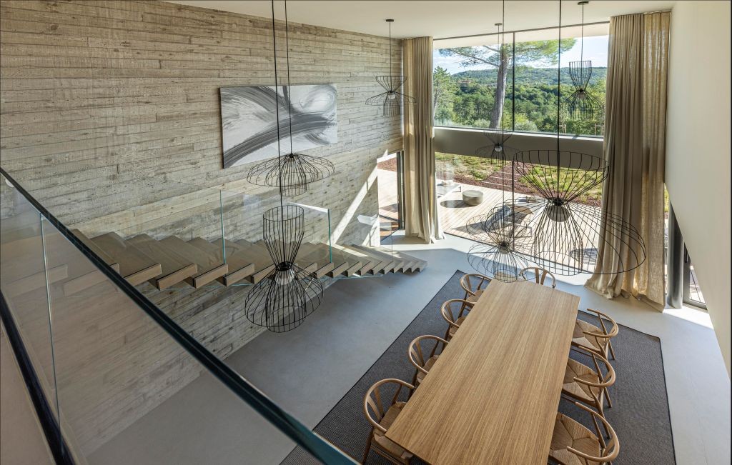 The landscaped grounds combine Mediterranean plants, natural stone, and carefully designed outdoor areas, while features such as green roofing contribute to energy efficiency and sustainability. Private parking is available within the residence.