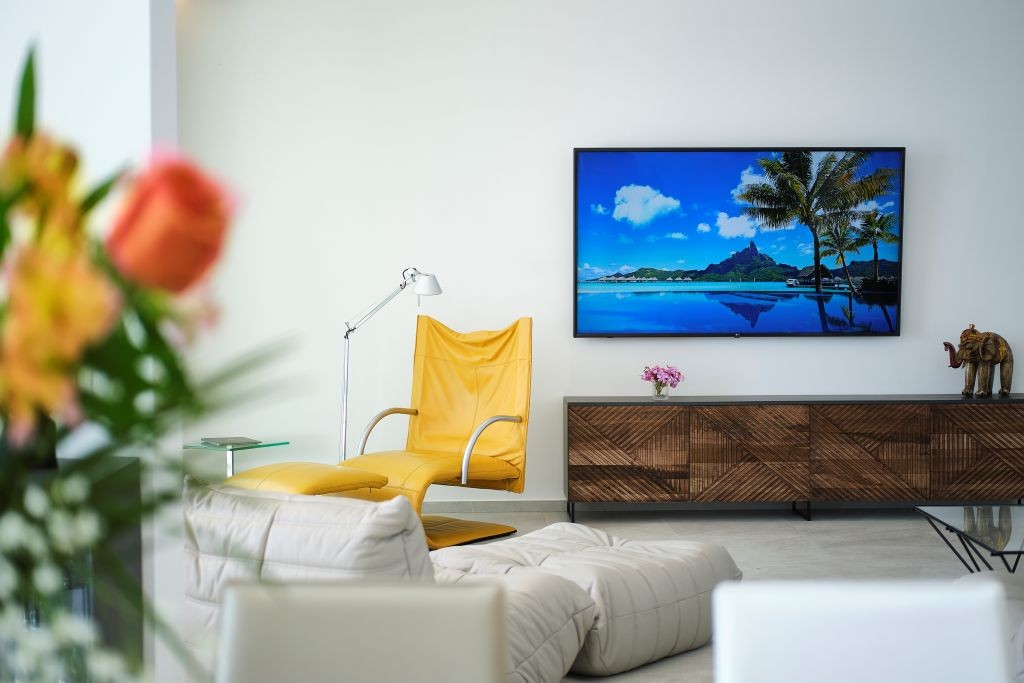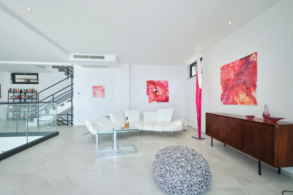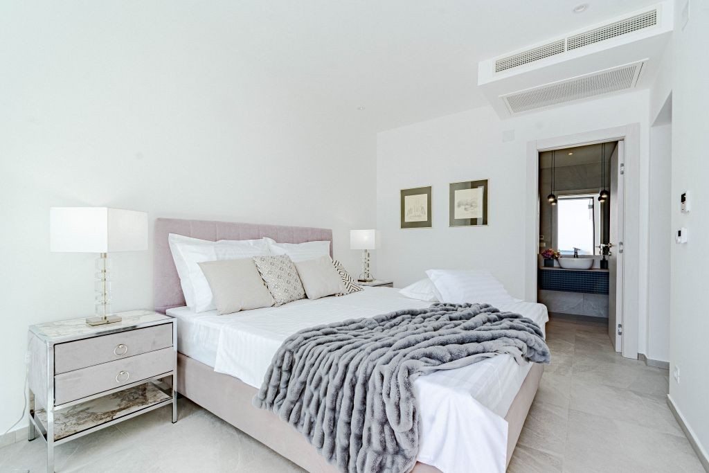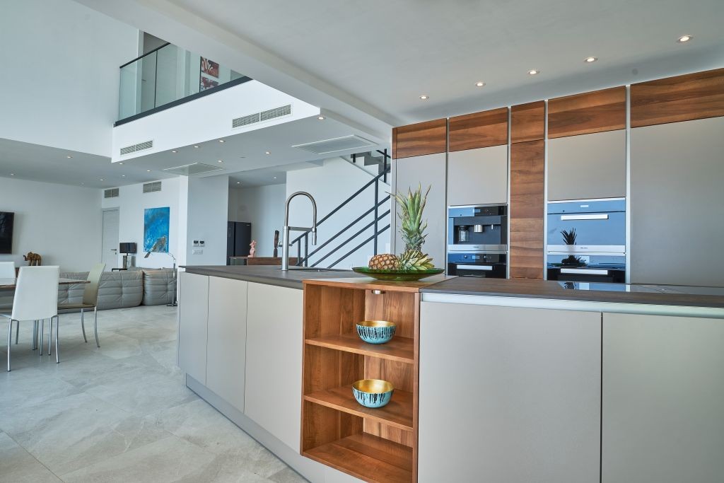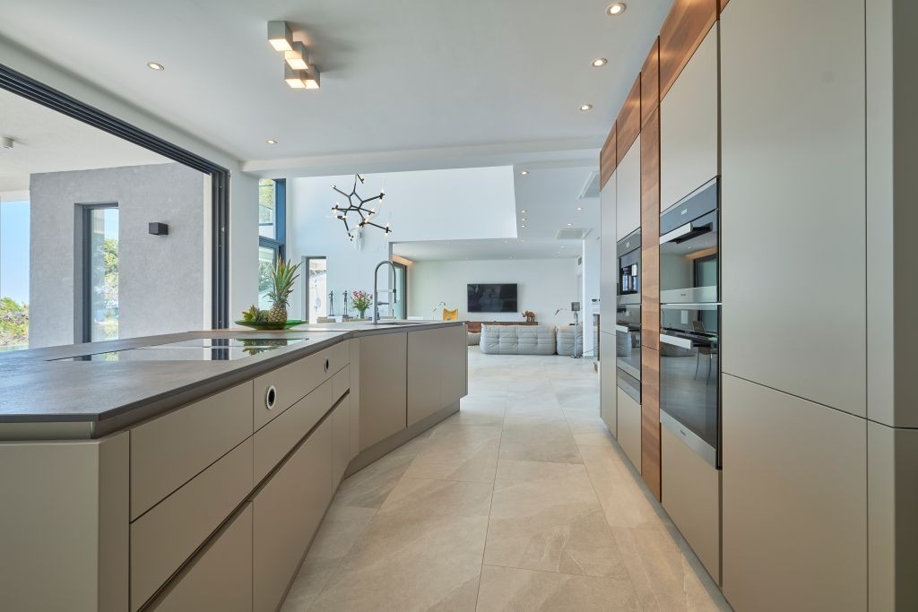 Designed to accommodate up to 12 guests, the property features six generously proportioned, air-conditioned bedrooms, each with its own elegant en-suite bathroom. The main living level includes a fully equipped contemporary kitchen with premium appliances, a sophisticated dining area, and a beautifully appointed living room furnished with carefully selected designer pieces, creating a seamless blend of comfort and understated elegance.