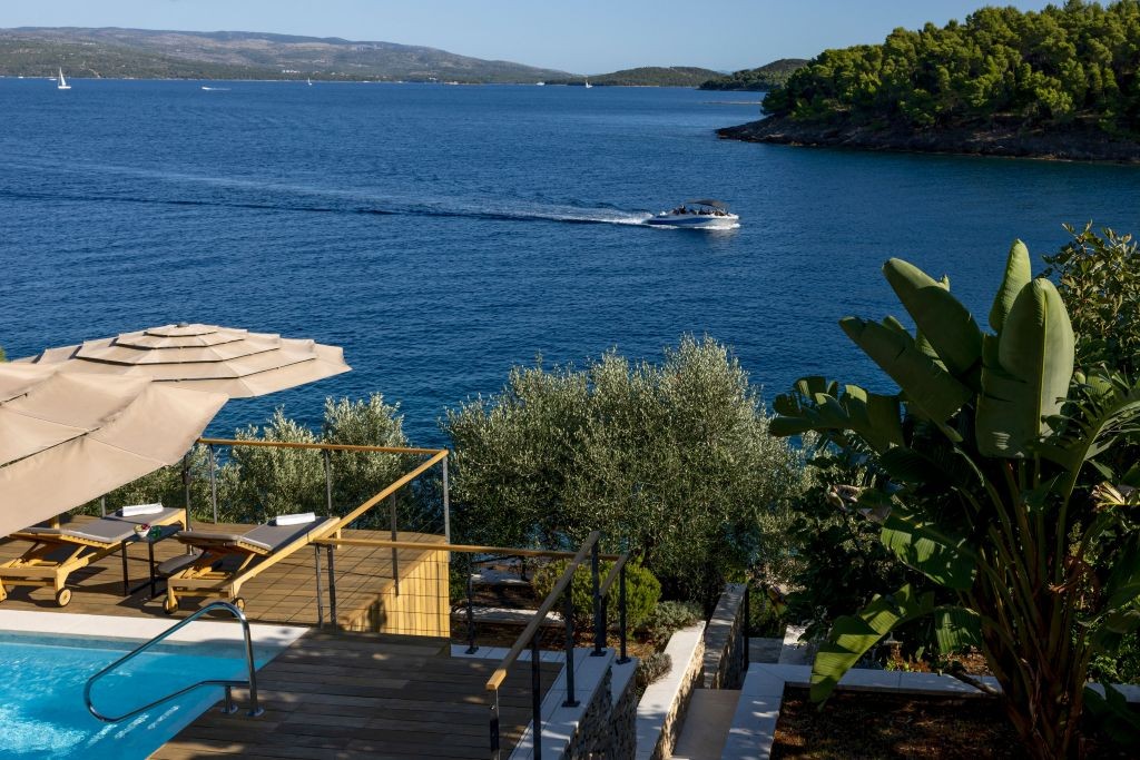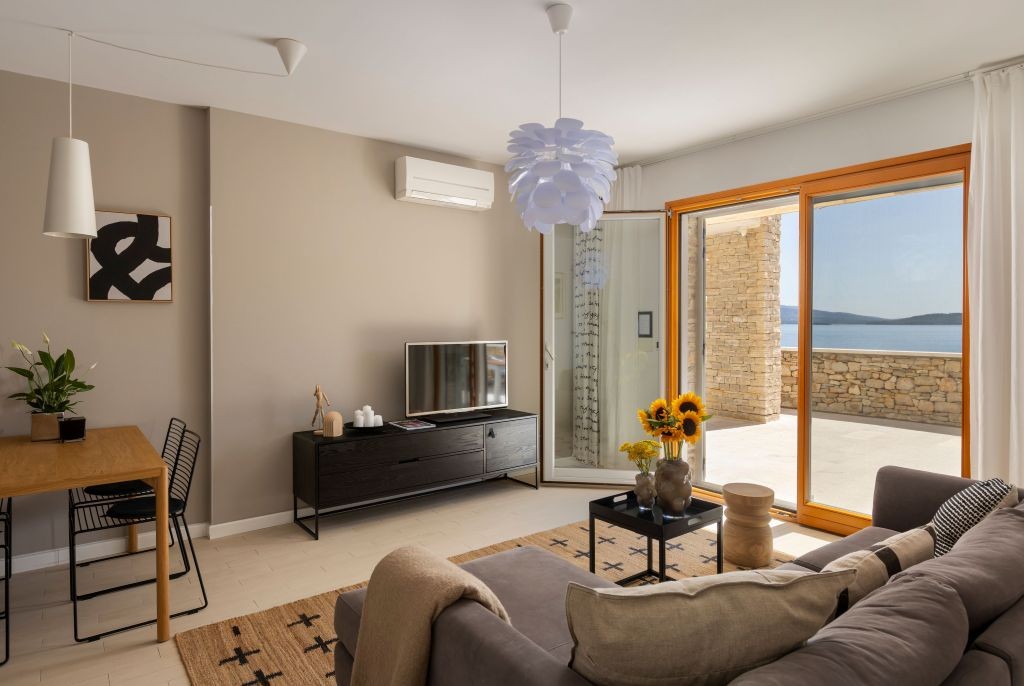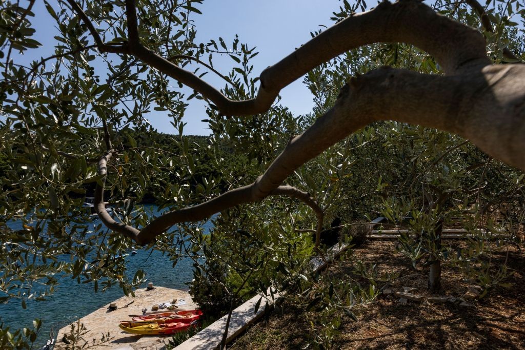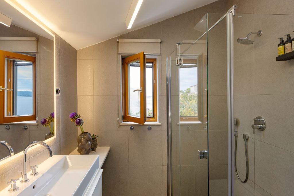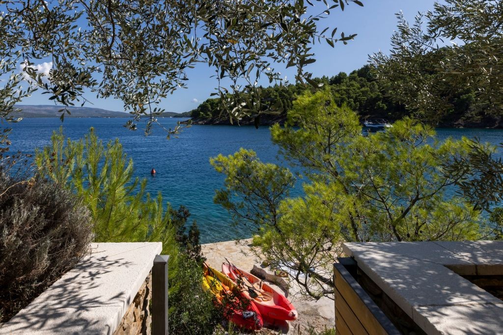 Outdoors, Villa House63 opens into a private world of leisure and authentic island living. A heated swimming pool, sun loungers with umbrellas, an outdoor shower, and a peaceful garden invite guests to unwind under the Croatian sun. The villa’s waterfront position enhances its charm, offering breathtaking sea views from the terrace and creating the perfect backdrop for outdoor dining. A summer kitchen and barbecue area make alfresco meals effortless and memorable, while the included amenities — two kayaks, one SUP board, and boat mooring — allow you to explore the crystal-clear Adriatic at your own pace.
