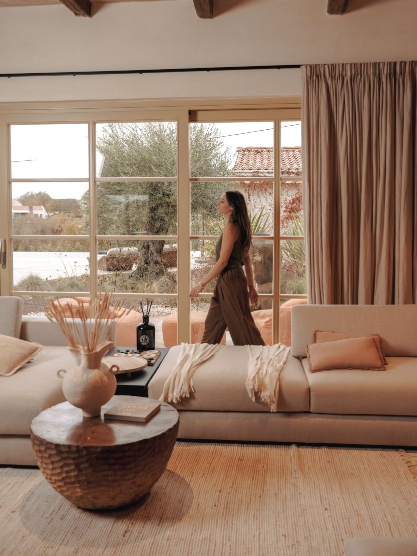 The heart of the villa is the grand living area, dominated by an impressive floor-to-ceiling window that stretches the entire length of the room flooding the space with natural light and frames a picturesque view of the outdoor area. Adjacent to the living room is the dining area, centered around a large wooden table that can comfortably seat all eight guests. The adjacent kitchen is a chef’s dream, equipped with top-of-the-line appliances. Its design is both functional and beautiful, with warm, rustic accents that add character and charm. The open-concept living space combines rustic charm with modern luxury. High, beamed ceilings and natural wood finishes create a sense of rustic opulence.