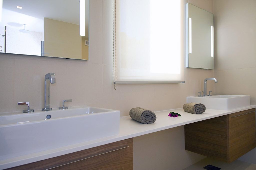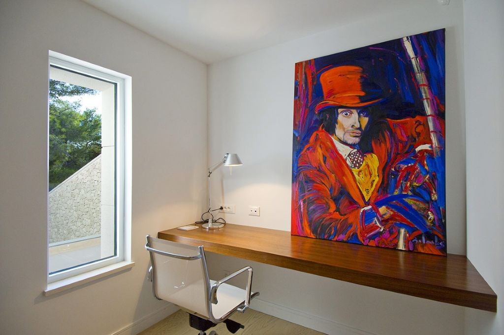 Inside, the villa is equally impressive. The spacious ground floor features an open-plan layout with floor-to-ceiling sliding glass doors that blur the line between indoors and out. On the first floor, two large south-facing bedrooms each offer their own terrace, dressing room, and spa-style bathroom. The second floor is home to the spectacular master suite — a true showstopper — while a fourth bedroom on this level features its own basin and enjoys access to a bathroom on the floor below. For guests who need to stay connected, a dedicated office provides a private space to work in comfort.