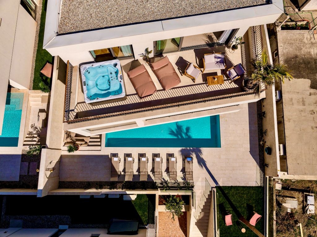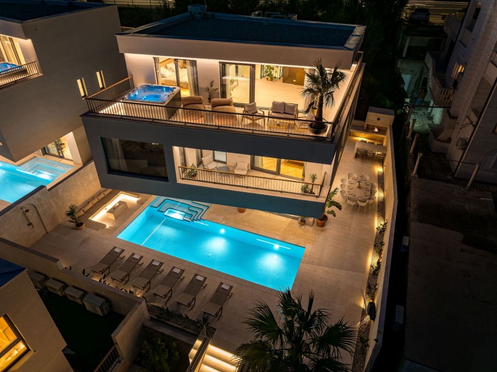 The villa’s outdoor spaces are made for relaxation and entertainment. Guests can enjoy a private jacuzzi, BBQ area, garden lounge, and an outdoor shower, all complemented by the villa’s lush surroundings. Private parking ensures convenience, while the terrace provides the perfect setting to unwind under the Adriatic sun or starlit skies.